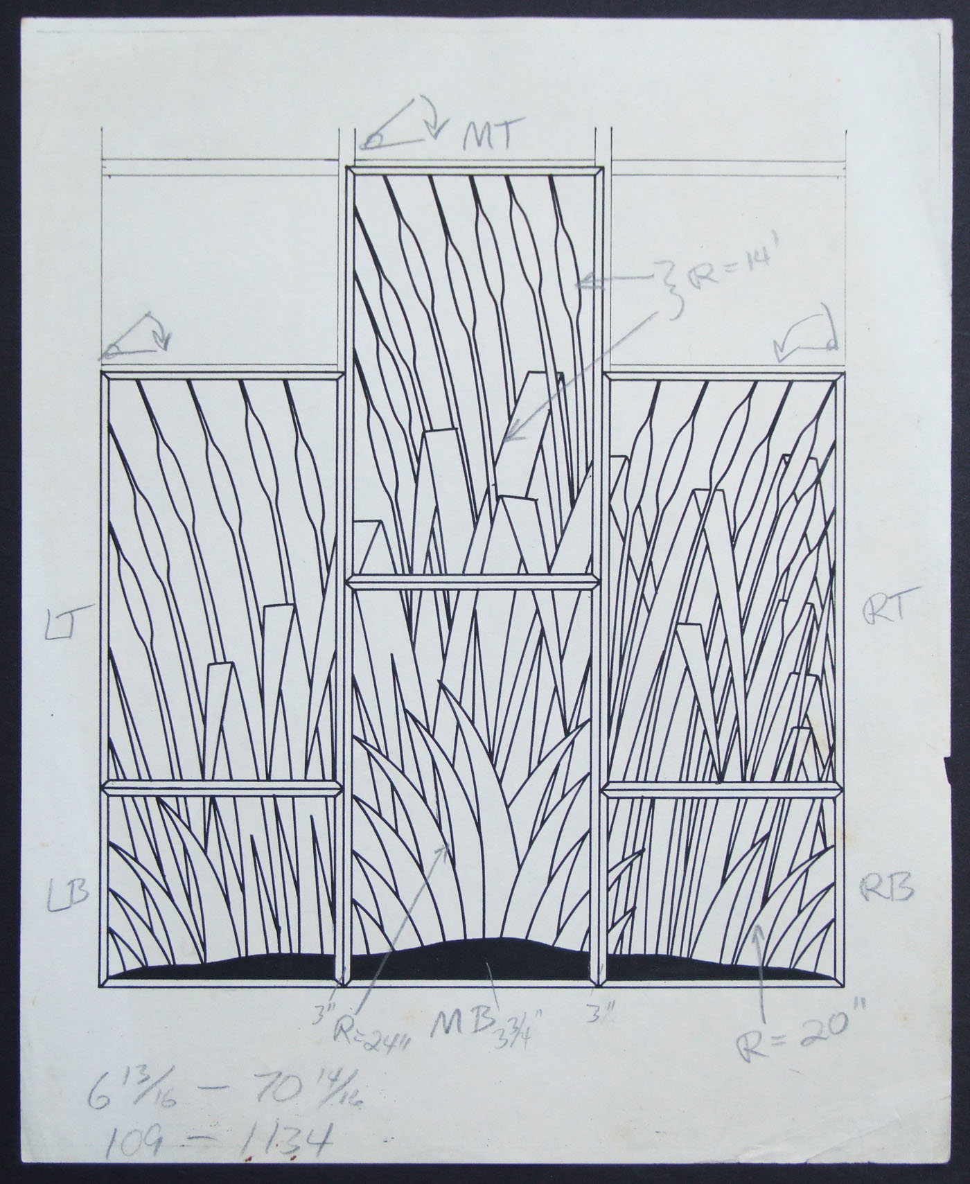 Mitten Gates' architect-designed home was razed by a subsequent owner, presumably destroying the "Cattails" window, along with an abstract textured aluminum "Tree" that I created to replace a dead Dutch Elm which had grown up through a large opening in her back porch roof, though I have apparently lost any photographs of it.