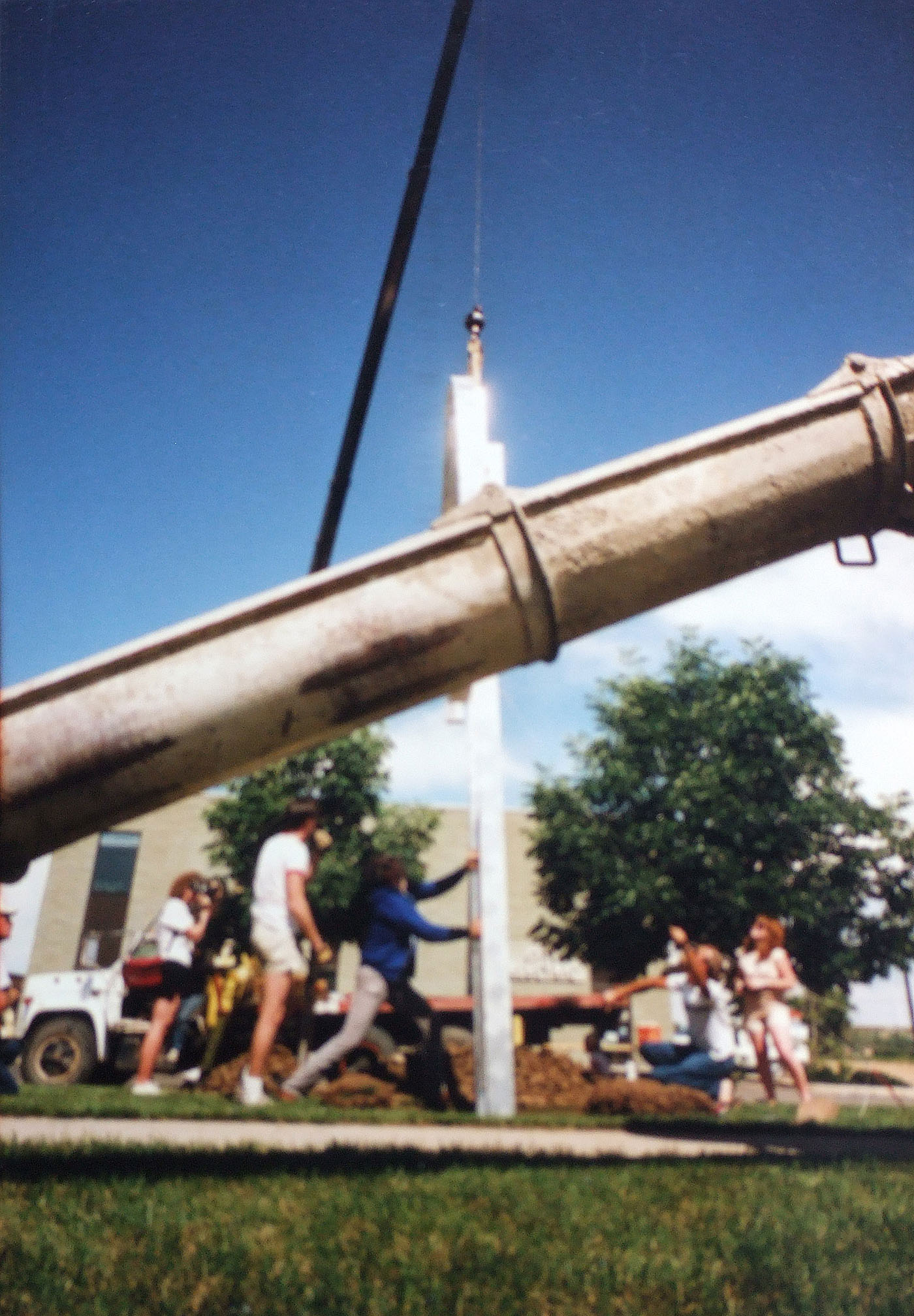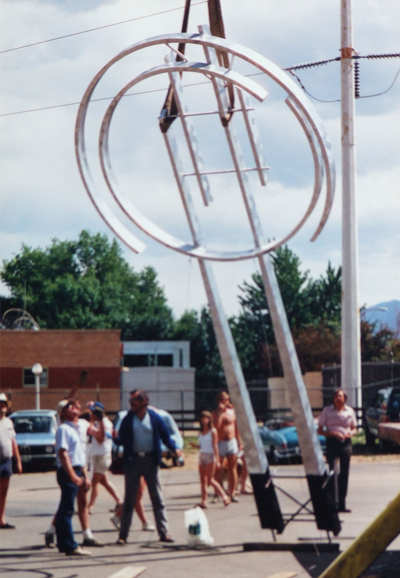 These two photographs show the raising of "Outlet," an original 18' tall textured aluminum sculpture fabricated from 2" by 6" thick-walled rectangular tubing, which was my first major effort at creating truly public outdoor sculpture. (I'm the dude inexplicably clad in a blue hoodie on the day of the Summer Solstice!)