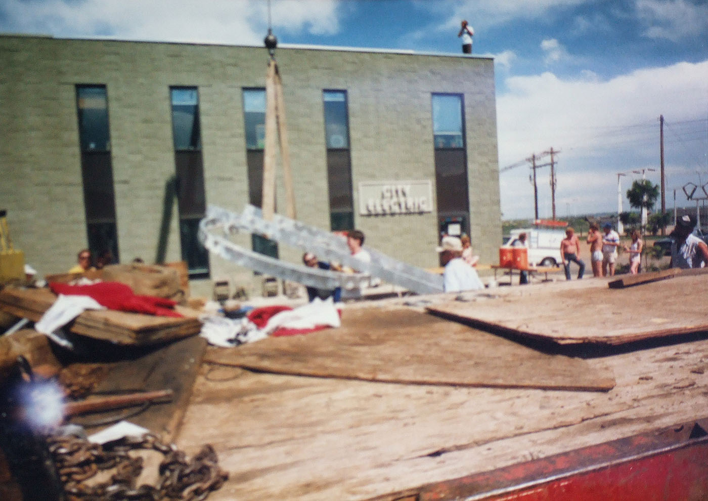 Mr. George Bernsen, the original owner of City Electric (standing at the far right), was kind enough to trade me for a substantial portion - $6,000 - of their fee for providing my studio with 220 volt, 3-phase industrial-grade wiring, which the power company brought in underground to preserve our view of the Front Range of the Rockies. Mr. Bernsen was a real art patron and loved "Outlet!"