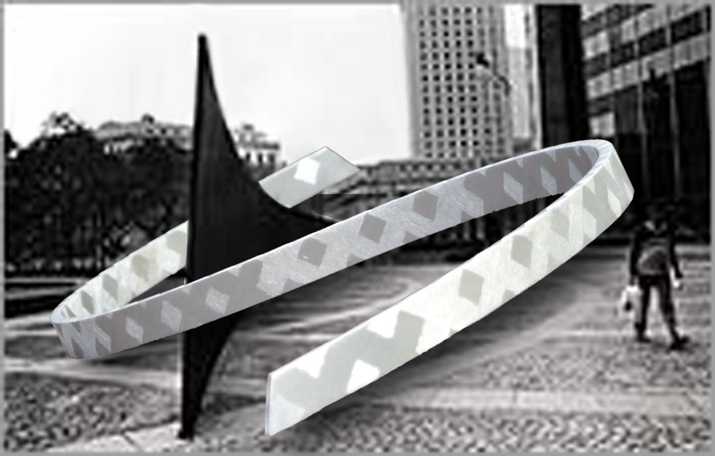 This is my humorous homage to Richard Serra's work. It represents a full embrace of his destroyed "Tilted Arc" masterpiece by my original artwork (titled "Recurve" of course), with the textured aluminum sculpture seeming to levitate above the now barren Foley Plaza floor.