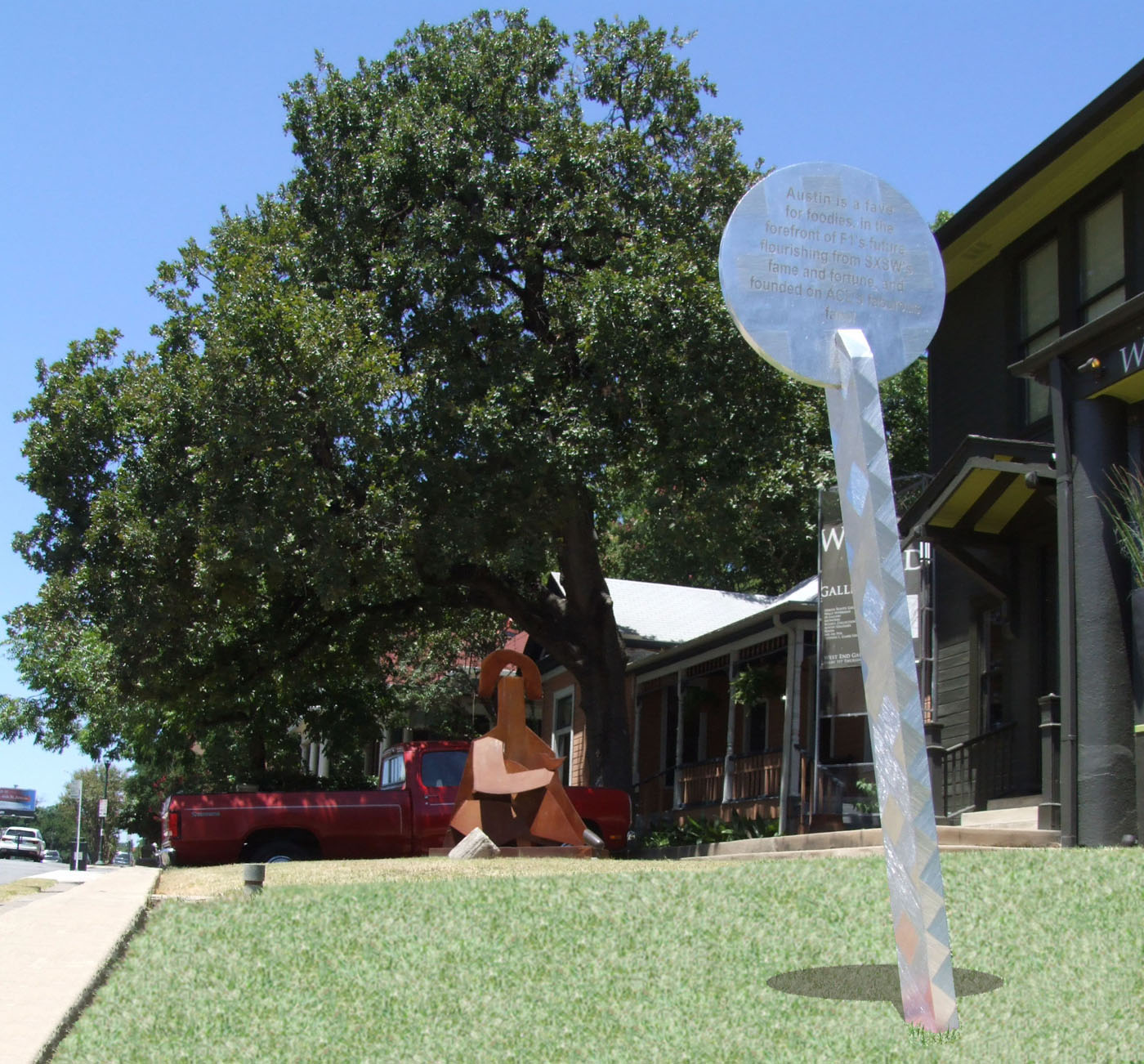 This first Tweetures design, titled "All About Austin," is a photographic mock-up of the actual 18" tall scale model in front of the Wally Workman Gallery, though the dark gray laser-engraved lettering doesn't show up well in this photo. My eventual proposal to her and her partner will be to install an 18' tall outdoor sculpture in the gallery's front yard, sited in a buried 6" by 18" by 48" stainless steel pocket nested in reinforced concrete so the work could ideally be sold and replaced without digging up the gallery's lawn again. Definitely feasible!
